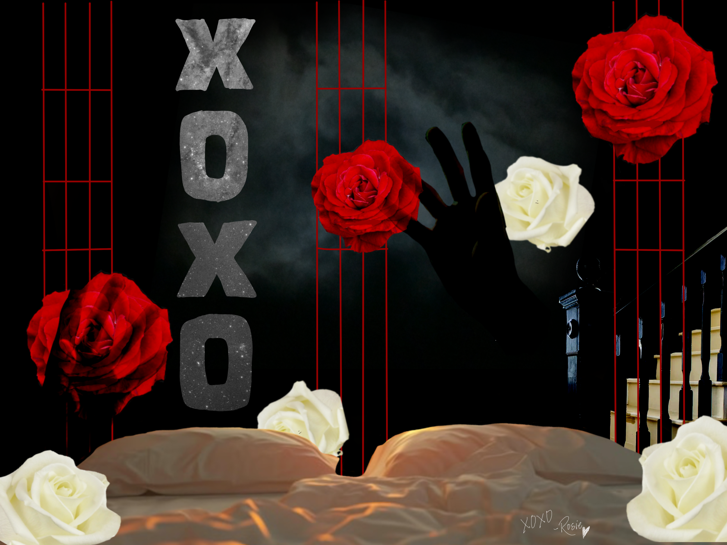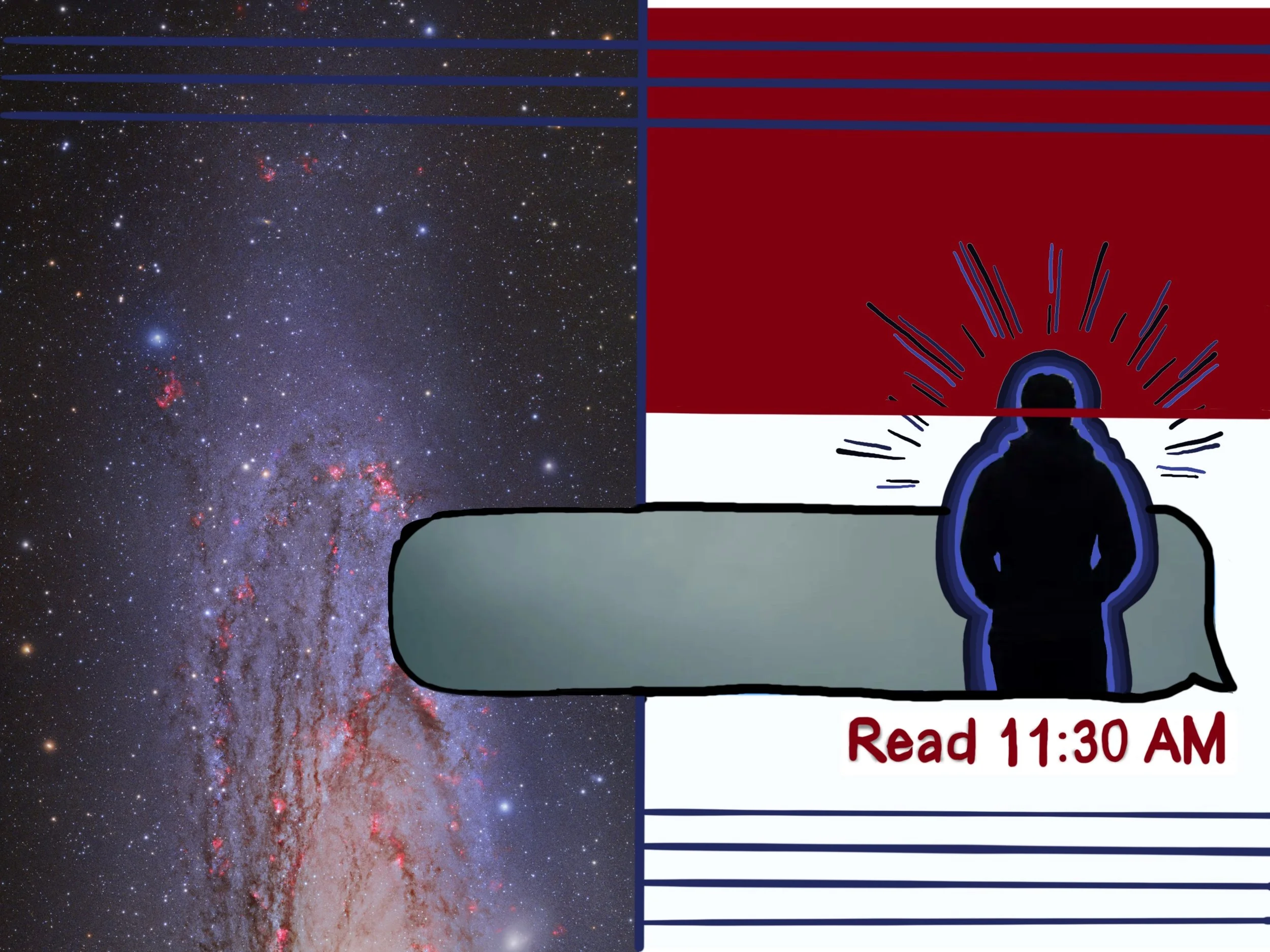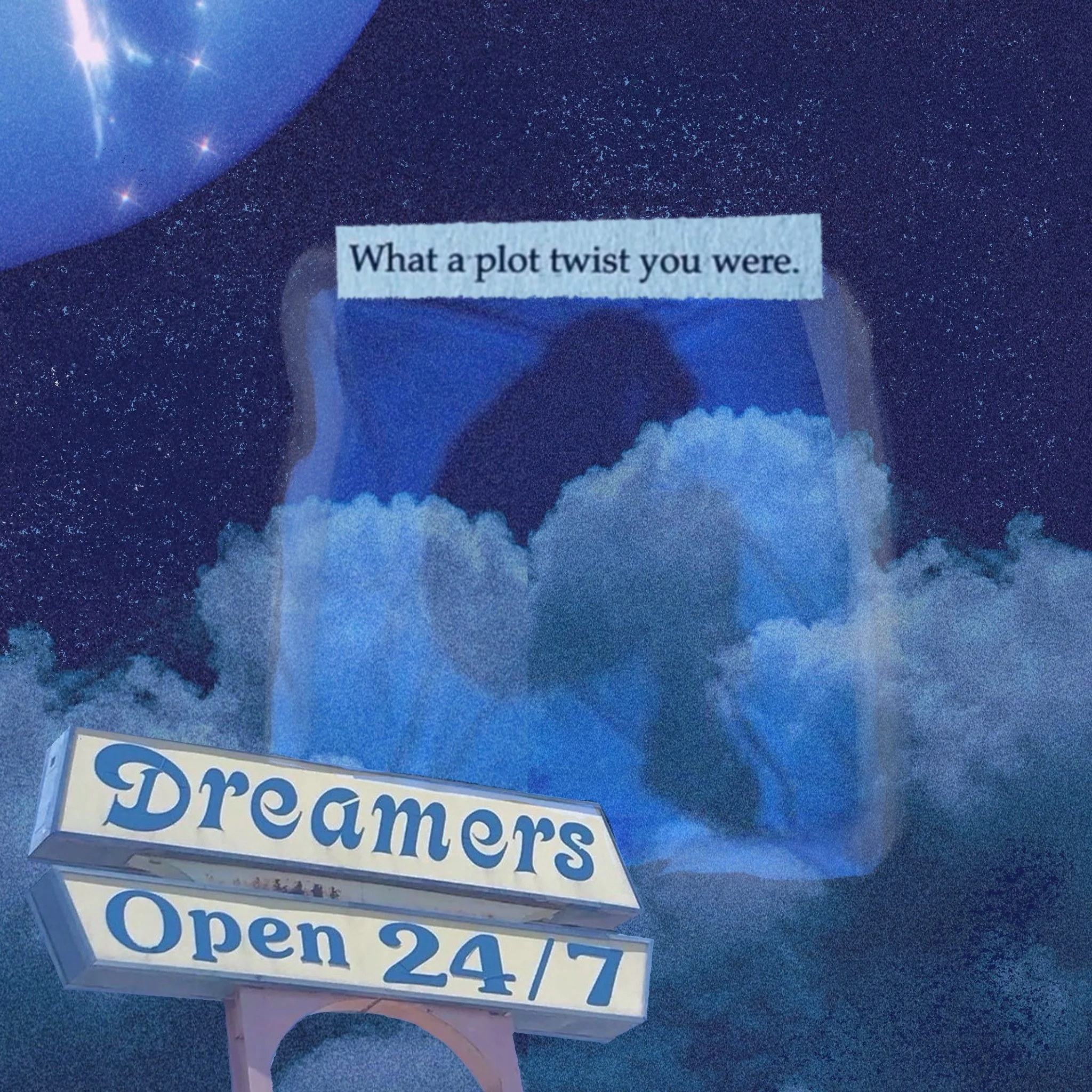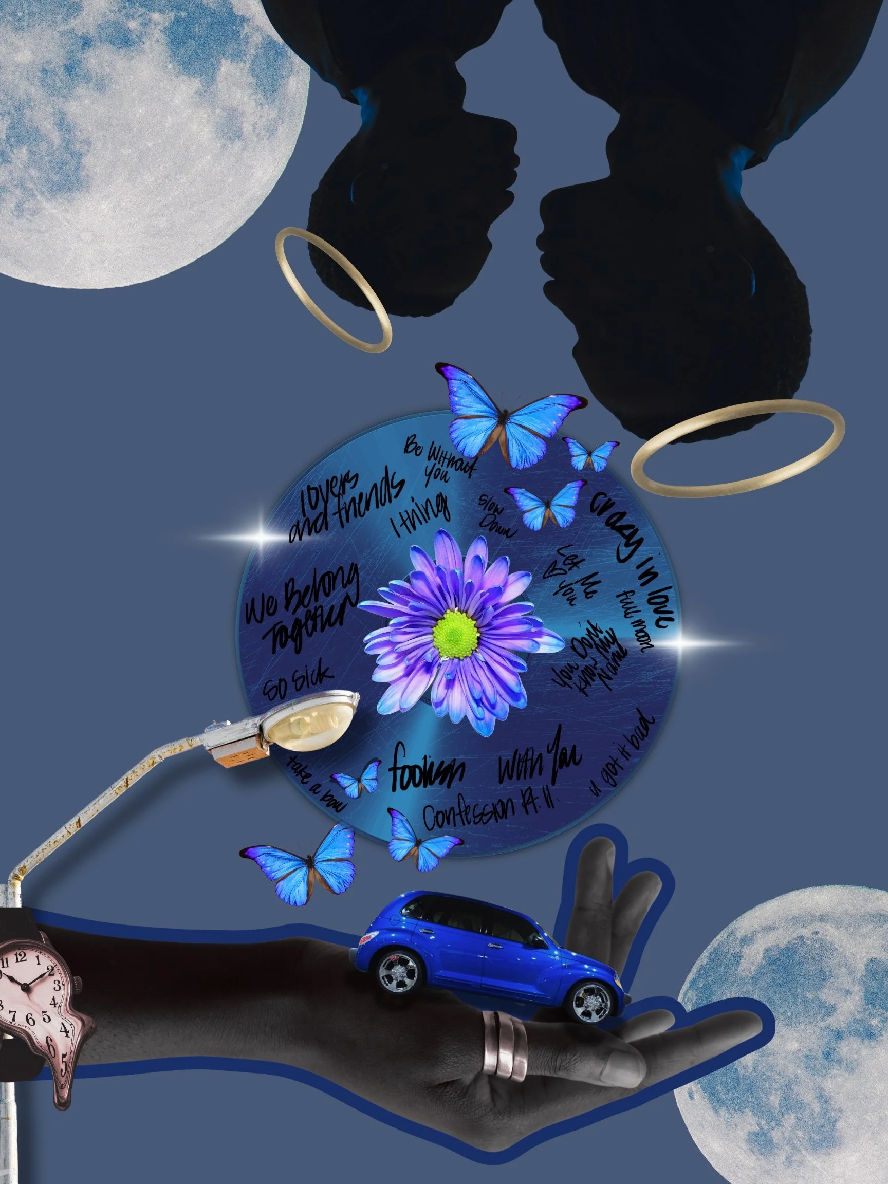 The piece centers on a powerful sense of yearning and longing for motion and movement. The use of planes, a classic car, and reaching hands all set against a rich, deep blue curtain, giving the piece a theatrical quality. The central image, a nod to the planet Neptune, symbolizing dreams and the subconscious. This is in direct conflict with the two "STOP" signs, which introduce a sense of pause, a barrier, or an external force halting movement.